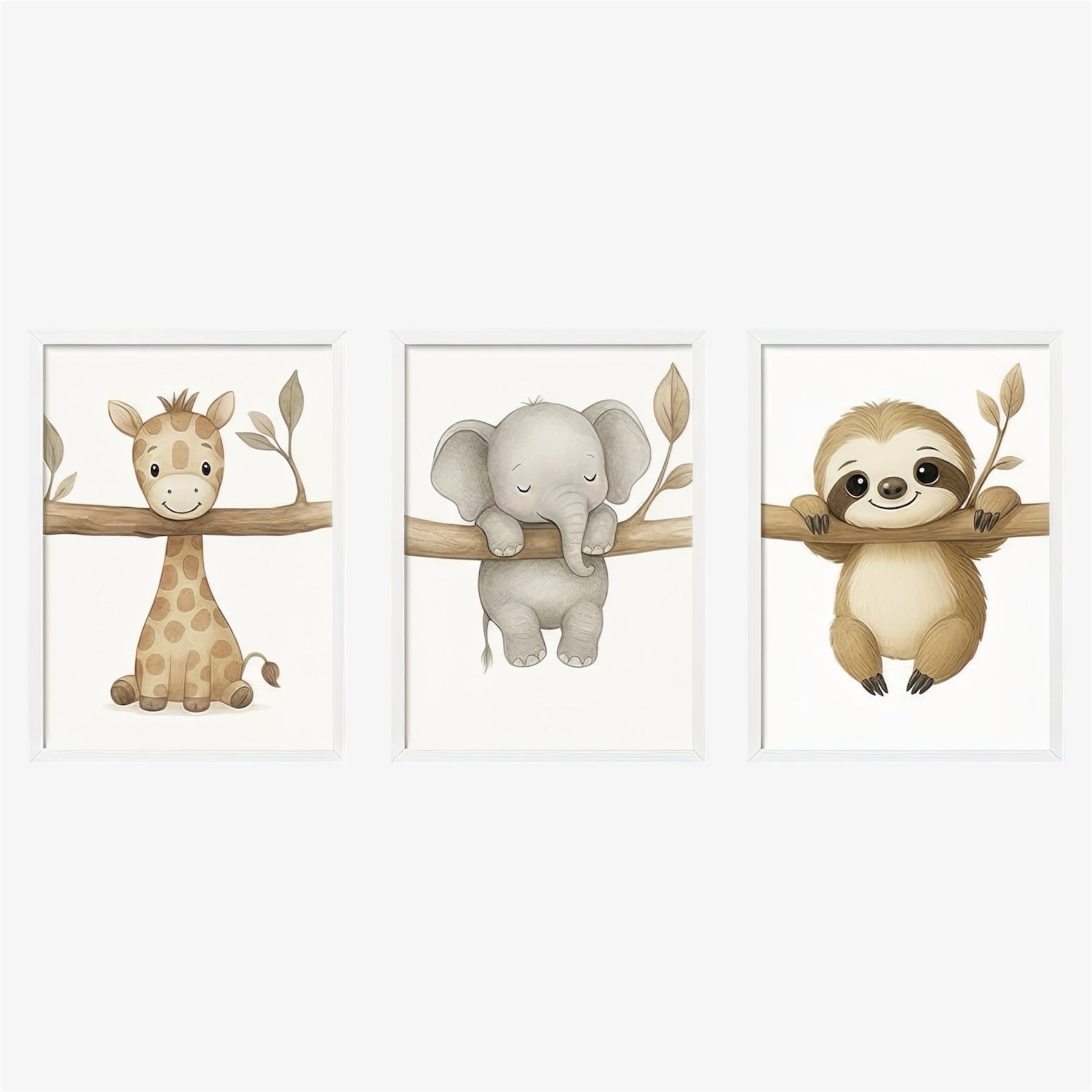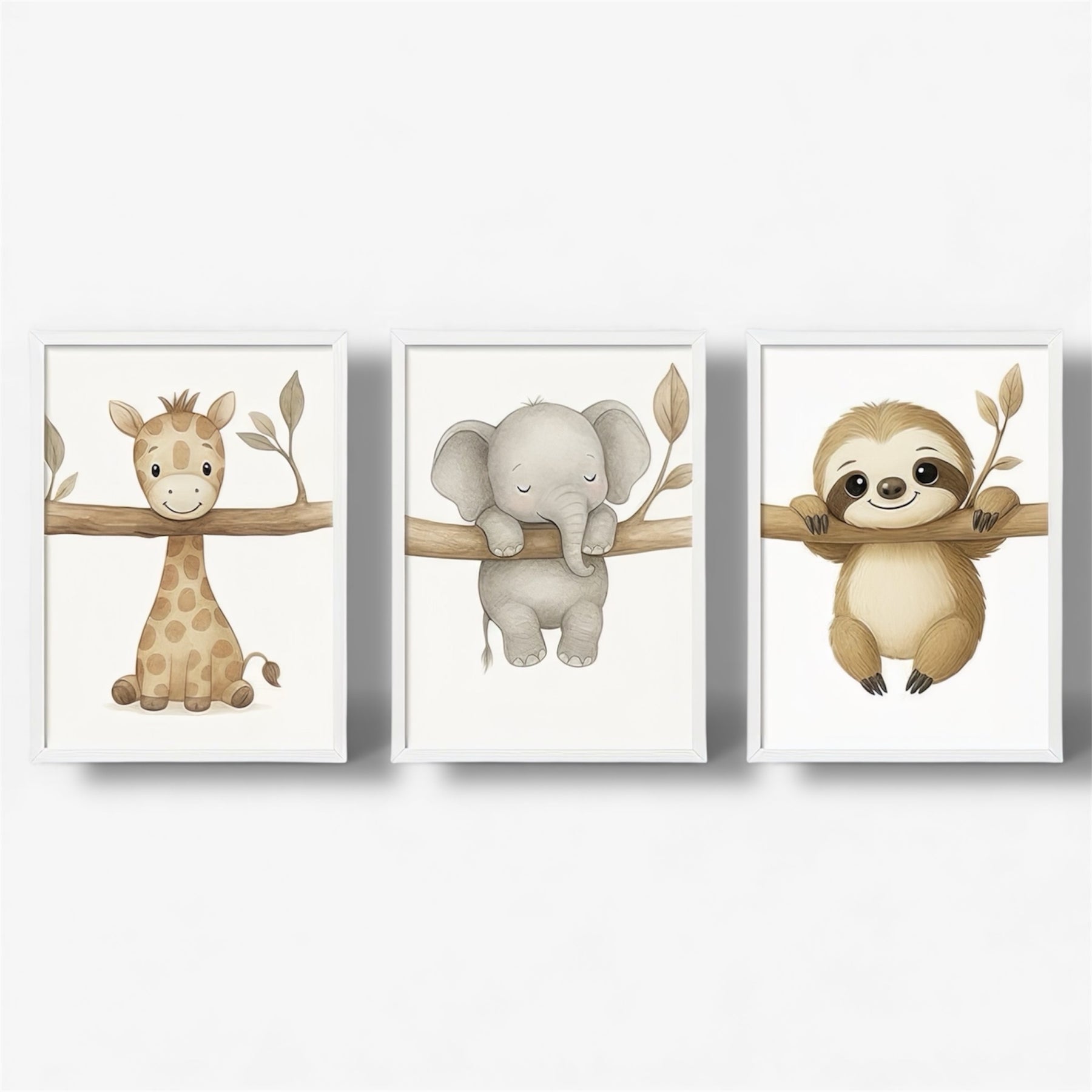 פוסטר קיר מקסים בדוגמת חיות (פיל וג’ירפה ועצלן) שמתאים במיוחד לחדר תינוקות, חדר ילדים או פינת משחק. מוסיף אווירה חמה, נעימה ומלאת דמיון, מושלם לעיצוב חדר עם ניחוח של טבע, ילדות ופשטות